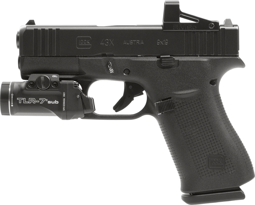 G43X - Die neue subkompakte GLOCK Slimline Pistole in MOS Konfiguration mit RMSc Rotpunktvisier Die G43X MOS ist als Kombi mit einer Streamlight TLR-7® Sub und einer Shield RMSc erhältlich. Das neue Slimline Modell G43X MOS kombiniert zwei bekannte GLOCK Eigenschaften. In Kombination mit dem Streamlight TLR-7® Sub und dem Shield RMSc machen das schlanke Design und das modulare Optiksystem diese Pistole zum perfekten taktischen Partner.