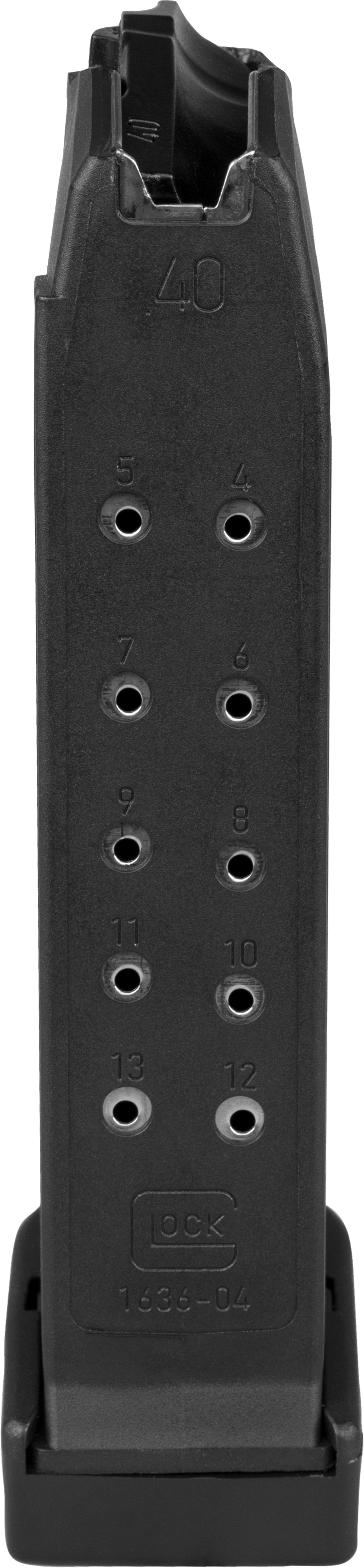 MAGAZIN G23+1 14 SCHUSS | 40 S&WDieses GLOCK Magazin besteht aus einem gehärteten Stahleinsatz, der von einem High-Tech-Polymer ummantelt ist, um das Magazin zu schützen und eine Verformung zu verhindern, selbst wenn es aus großer Höhe fallen gelassen wird. Die hochwertige Feder und der Follower gewährleisten eine zuverlässige Zuführung von der ersten Patrone, die durch eine vollständig komprimierte Feder zugeführt wird, bis hin zum letzten Schuss. Der doppelt geschnittene Magazinkörper funktioniert auch mit einem umgekehrten Magazinverschluss bei Gen4 und Gen5 GLOCK Pistolenmodellen.