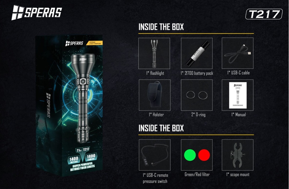 Le SPERAS T217-V2 est la version mise à jour du T217, l'une des meilleures lampes de poche à LED en termes de portée de rayonnement avec Luminus SFT40 2.0, un design de structure avancé et un design de pilote. La lampe de poche peut atteindre une puissance maximale de 2000 lm et une portée maximale de 1400 m, ce qui vous offre un faisceau de focalisation puissant pour mieux viser vos cibles ; La prise multifonction de type C prend en charge la charge de type C et le bouton de pression à distance de type C pour une utilisation plus simple et plus efficace. Le nouveau design du filtre de la caméra aide les chasseurs à conserver le faisceau rouge/vert lors de la chasse.