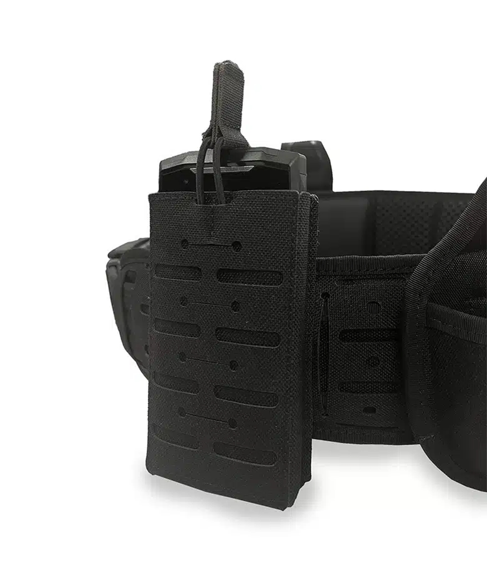 Système MOLLE et ruban auto-agrippant : Intègre un système MOLLE pour le port au ceinturon ou à toute interface MOLLE. La partie crochets du ruban auto-agrippant assure une fixation stable sur le ceinturon de service.